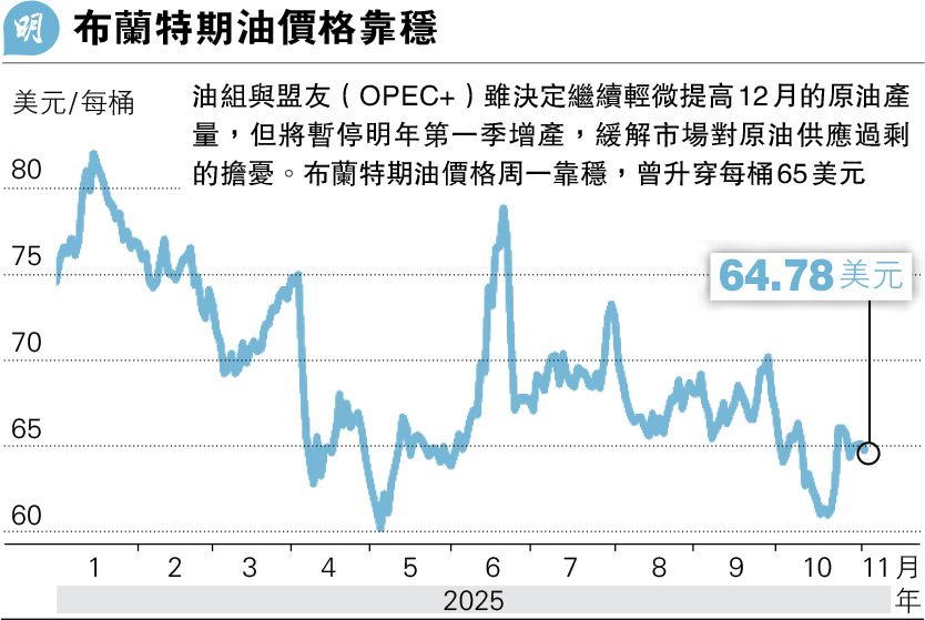 【明報專訊】油組與盟友(OPEC+)決定輕微提高12月的原油產量,但暫停明年第一季增產,是OPEC+今年4月以來首次宣布將暫停增產,緩解市場對原油供應過剩的擔憂。國際油價周一靠穩,曾升穿每桶65美元,紐約期油曾升穿每桶61美元。亞馬遜(美:AMZN)與OpenAI達成算力合作協議(詳見另稿),亞馬遜與主要科技股及晶片股早段股價上揚,推動納指向上。不過由於美國10月ISM製造業指數進一步陷入收縮區域,其升幅午夜前收窄。