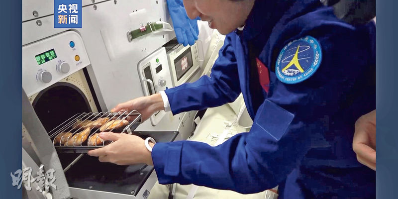 【明報專訊】中國載人飛船神舟21號乘組上周六抵達太空站,行李包括一部太空熱風烘烤機(俗稱「氣炸鍋」)。在神舟20號今天(5日)返回地面前,兩個乘組6位太空人首次在太空吃上即烤即食的雞翼、牛扒等佳餚,一眾太空人直言「在天上吃到這口太難得」。有關太空人「會師餐」畫面,引起海內外社交平台熱議。