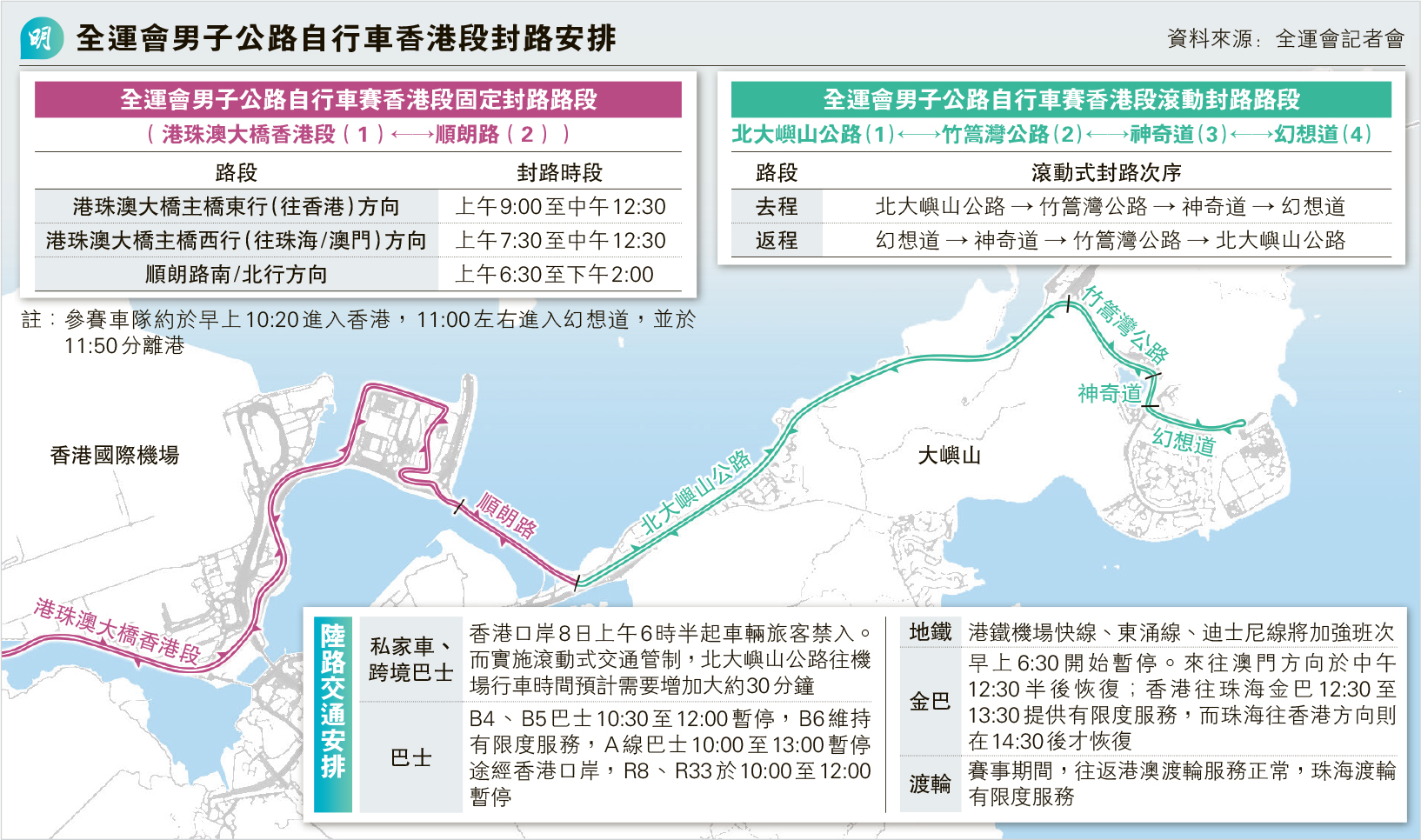 運輸署首席運輸主任關國恩表示,賽事有關路段會在當日實施管控(見圖),當局提醒,女子公路單車賽於9日在珠海舉行,當地會有大範圍封路,呼籲市民避免於9日上午往返珠海,以免造成不便。警務處新界南總區高級警司(行動)鄭威鍵提醒,周六比賽當日北大嶼山公路實施「滾動式封路」,來往機場和東涌的車程料延長約30分鐘,他呼籲前往機場的市民避免自駕。