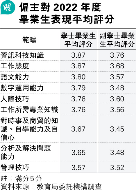 【明報專訊】教育局噚日發布僱主對2022年專上課程畢業生工作表現嘅意見調查,僱主對學士、副學位課程畢業生整體表現平均評分分別係3.75同3.57分(滿分5分),話係歷年新高。調查中有18%僱主對學士學位畢業生提出改善意見,當中近一成人提醒畢業生要更積極主動、要願意接受人哋建議,同埋更守時自律。