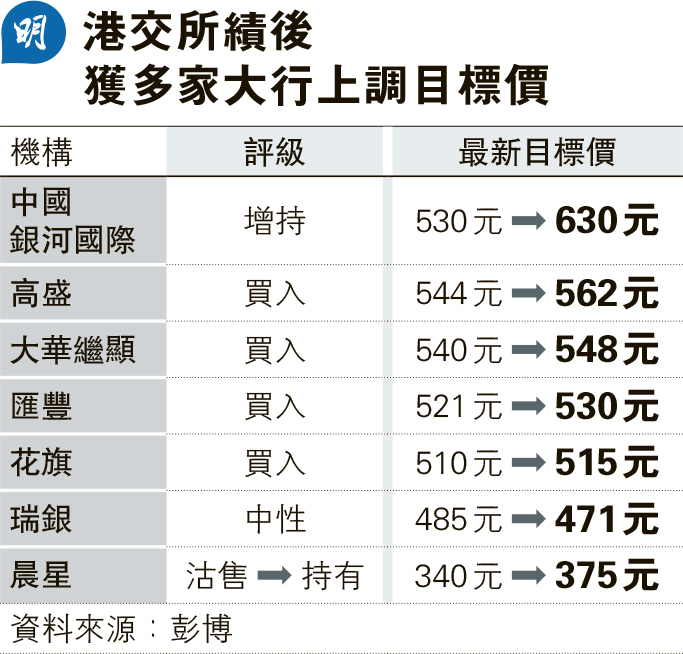 大行上調港交所目標價 中國銀河國際看630元最牛