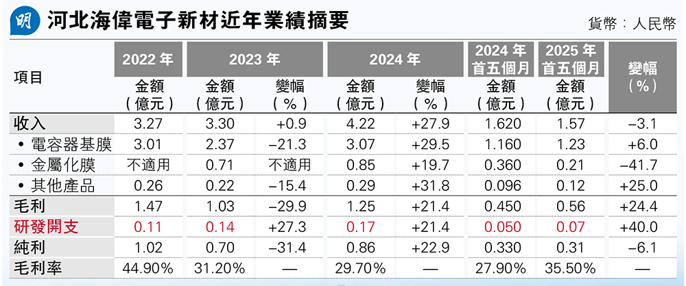 【明報專訊】從事電容器薄膜產銷的河北海偉電子新材(下簡稱:海偉)上周通過港交所上市聆訊,或短期可展開招股活動。集團產銷的電容器薄膜是薄膜電容器的主要構成部件,而後者廣泛應用於各種電子產品,是電子電路中不可或缺的元件之一。或由於此,比亞迪(1211)早參股了海偉,目前持有4.9%權益。