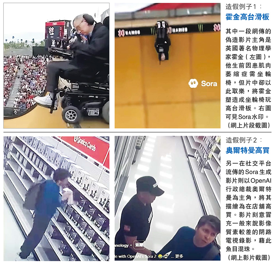 OpenAI今年9月30日推出Sora,TikTok和Instagram等社交平台隨即湧現大量假影片。OpenAI有採取多種措施防止濫用,例如《紐約時報》的測試就顯示,程式很多時會拒絕生成涉及名人的影片或生成暴力內容的影片。不過,全球社交平台充斥用家製作的假影片中,仍包括投票作弊、暴力示威和襲擊等假片,不少藝人甚至已故名人都成為被生成影片的對象,有用戶就生成出OpenAI行政總裁奧爾特曼在店舖高買的影片,亦有人生成出顯示已故天體物理學家霍金用輪椅做特技的影片。
