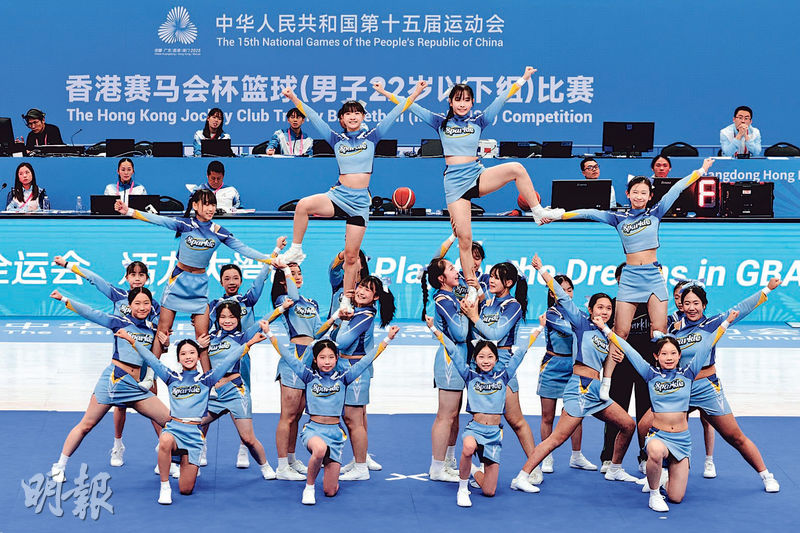 【明報專訊】十五運會男子籃球U22比賽昨晚在紅館舉行,出賽港隊固然是重點所在,由22名梁式芝書院學生組成的啦啦隊「Sparkle」則成為賽前焦點,她們在10首廣東歌的節拍帶領下,為觀眾做出連串高難度動作,率先炒熱氣氛。書院副校長梁仁昌稱,隊員最近3個月密集式訓練,務求上演一場完美表演,喜見昨晚演出順利,觀眾樂在其中。Sparkle下周日將踏上啟德體藝館舞台,為男子花劍及女子佩劍項目打氣。