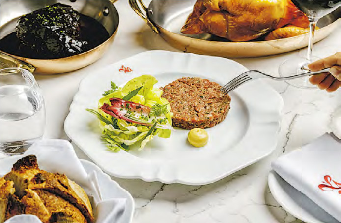 【明報專訊】於中環主打親民精緻法國菜的LALA,最近推出全新午市套餐(每位$358),主廚將多款招牌菜式如蒜香芹菜田雞腿、法式酥皮肉批及味噌芥末牛肉他他,納入套餐恆常菜式中,大家可以更貼地的價錢享用法式精緻美食。晚市方面,亦推出每位$888的共享式套餐,前菜有香柑醃油甘魚、昆布松露魚子凍意粉;主菜則有升級版法式牛胸腺酥皮千層盒(加入藍龍蝦及黃酒忌廉醬)等。除套餐外,亦新增北海道帶子雲吞配羅勒薑牛油、秋日栗子雜菌濃湯、大西洋石斑魚配法式香草醬,以及香橙味噌苦白菜等單點菜式。