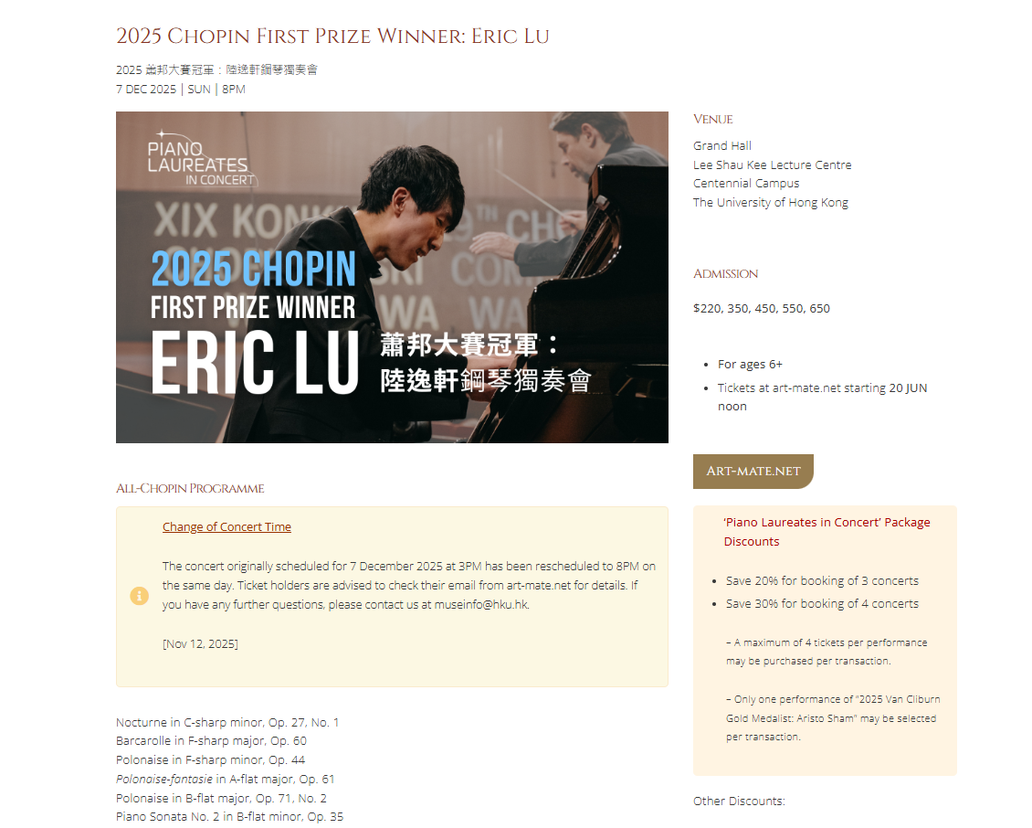 香港大學早前邀請第19屆蕭邦國際鋼琴大賽首獎得主、美國華裔鋼琴家陸逸軒(Eric Lu)於12月7日下午3時出席「港大繆思樂季」獨奏會,但校方今(12日)於節目網頁宣布,活動將改至當日晚上8時舉行。港大稱,改動是由於陸逸軒盼有更多時間休息。
