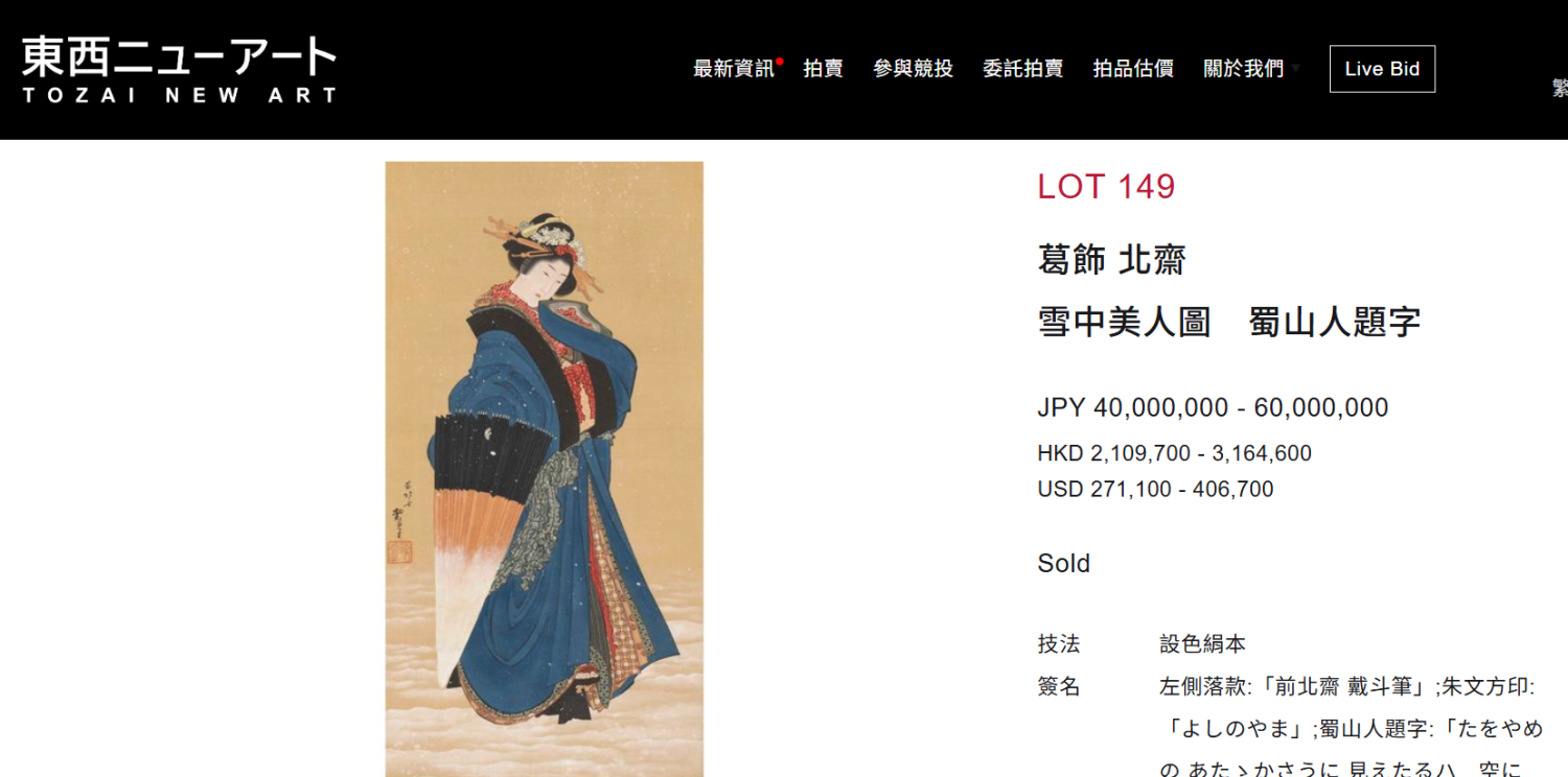 即時熱點 浮世繪畫家葛飾北齋《雪中美人圖》逾3100萬港元成交 創旗下作品拍賣最高價紀錄 (15:40) 發佈於 3 週 前 2025 年 11 月 12 日 By 明報 日本江戶時代後期浮世繪畫家葛飾北齋(1760至1849年)的親筆畫《雪中美人圖》在東京舉行拍賣,並以6.21億日圓(約3122萬港元)由家具及日用品銷售巨頭NITORI購入,創下葛飾北齋作品拍賣史上成交價最高紀錄。作品將由似鳥文化財團營運的小樽藝術村・浮世繪美術館(北海道小樽市)收藏,今後計劃對外展出。作品描繪了被認為是吉原花魁的女子在雪中的形象,推斷創作於1813至1819年前後。(共同社) 相關文章:拍賣熱門HOTPICK編輯推介葛飾北齋雪中美人圖 Up Next 秋冬觀鳥Q&A 11月冬候鳥抵港高峰 觀鳥會介紹4候鳥、觀鳥貼士 (16:00) 不要錯過 天氣|天文台:周三有微雨 短暫時間有陽光 最低21°C (20:58) 繼續閱讀 贊助商 猜你喜歡 短片回顧大埔宏福苑五級火 逾43小時大火連燒3天【多圖】 (19:00) 大埔宏福苑五級火 短片:外傭接僱主來電方知起火 至今未能聯絡一印傭朋友 (18:18) 大埔宏福苑火災 商店食肆提供支援【持續更新】 (16:38) 短片:宏福苑居民掩面痛哭「家沒了」 (14:55) 短片:有宏福苑居民尚未尋獲七旬母 (14:33) 外國專家:宏福苑五級火如英國格倫費爾大火翻版 火勢一座傳一座現骨牌效應 (12:45)