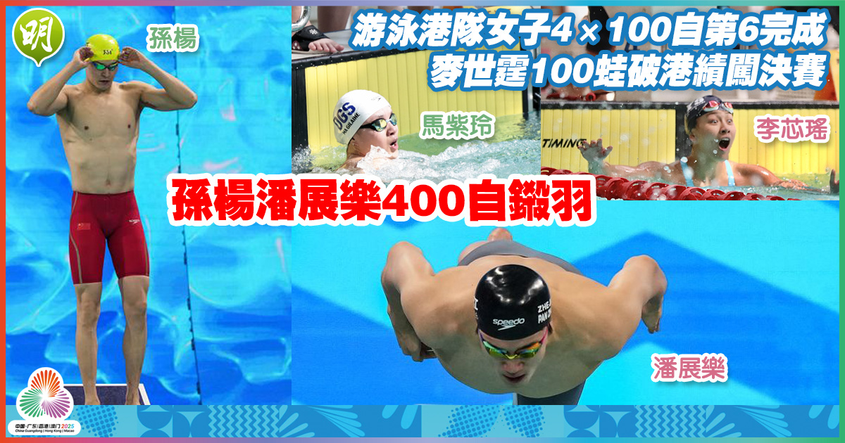 粵港澳全運會游泳項目今早(10日)起一連8日於深圳大運中心游泳館展開,港隊小將李芯瑤、王欣桐、文薈喬及馬紫玲聯手出戰女子4×100自由泳接力賽表現驚喜,初賽以0.08秒優勢力壓陝西隊晉級,最終在同晚決賽獲第6名完賽。而今屆游泳賽事首面金牌由山東隊新星張展碩,在男子400米自由泳決賽打破世界及全國青年紀錄下奪得,擊敗同場競技的浙江隊名將孫楊及巴黎奧運雙金得主潘展樂。