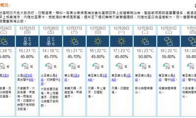即時熱點 天文台:下周二顯著轉涼 下周三低見13°C (12:03) 發佈於 1 個月 前 2025 年 11 月 13 日 By 明報 【12:02】天文台上午11時30分的天氣概況顯示,下周一(17日)晚上北風增強,下周二(18日)顯著轉涼,下周三(19日)氣溫下降至13至14°C左右。(天文台) 【10:53】天文台今早(13日)9時50分的天氣概況顯示,預料一股強烈東北季候風補充會在下周初抵達華南沿岸,該區天氣顯著轉涼,風勢頗大及有一兩陣微雨。據天文台的香港九天天氣預報,今日至下周一(17日)溫度維持在20°C至27°C範圍(詳見本文附圖),下周二(18日)低見16°C,下周三(19日)進一步跌至最低15°C。(天文台) 相關文章:天文台天氣天氣速遞編輯推介 Up Next 紅葉美景|圖看多倫多白雪紅楓共舞 (10:08) 不要錯過 賞芒草季節 大東山之外 彌勒山郊遊徑、羗山郊遊徑可賞芒草 (13:09) 繼續閱讀 贊助商 猜你喜歡 聖誕節天氣|天文台特別天氣提示:正午氣溫較昨日低6至8°C 明早市區13°C (11:38) 天氣|天文台:聖誕日轉涼早上17°C 晚上降至15°C (21:09) 天氣|天文台:日間溫暖 東北季候風補充明早抵華南沿岸 (08:19) 天氣|天文台:周三早上最低19°C 日間溫暖部分時間有陽光 (20:56) 天文台料聖誕假期低見14、15°C 元旦日季候風持續影響華南 (12:20) 天氣|天文台:日間部分時間有陽光 最高22°C (08:32)