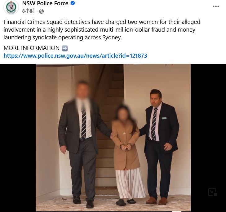 澳洲新南威爾斯省警方周三(12日)拘捕一對自稱算命師及風水師的越南裔母女,指控她們是一個大型金融犯罪集團成員,訛騙當地越南社群近7000萬澳元(約3.6億港元)和協助洗錢。