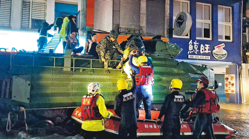 綜合台媒報道,其中宜蘭、花蓮受災最為嚴重,宜蘭東澳嶺10日至12日累計雨量突破1000毫米。宜蘭縣蘇澳鎮前晚積水一度超過1層樓高,當局出動AAV7兩棲突擊車和橡皮艇協助居民撤離,有在馬路中間浸水死火的私家車被軍車不慎輾成廢鐵;軍方表示,將配合當地鎮公所處理賠償事宜。蘇澳鎮積水昨天已退去,當局加緊清理淤泥、搶修水電和道路。