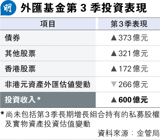【明報專訊】香港金融管理局昨日公布,外匯基金今年第三季錄得投資收入600億元,有關數字並未反映長期增長組合在第三季的估值變動,按相同準則計算,上季投資收入按年減少47.64%。第三季表現受累於美元匯價轉強,令非港元資產的外匯估值下調266億元,其餘類別如香港股票、其他股票和債券均錄得投資收入。金管局總裁余偉文表示,展望今年餘下的時間,投資環境仍然高度不明朗,當局會作出適當的防禦性部署,並維持高流動性、持續多元化投資,致力提高外匯基金長期投資回報。