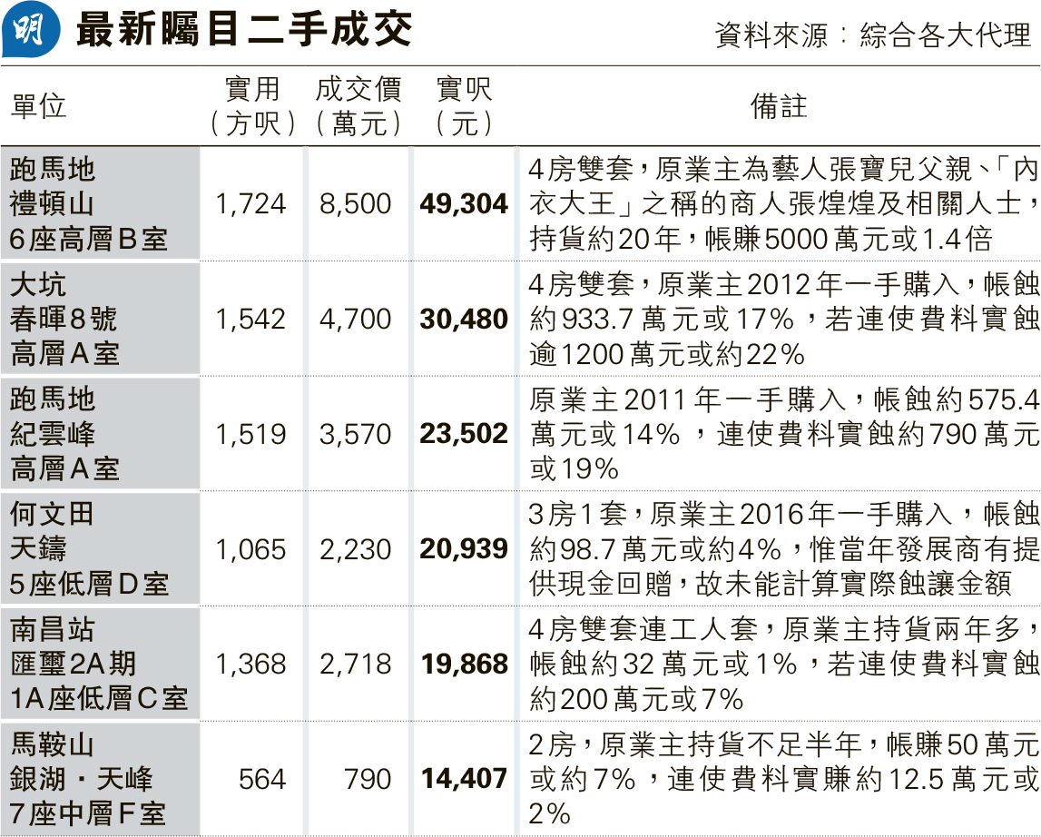 此外,跑馬地紀雲峰高層A室,實用面積1519方呎,3房雙套間隔,則以約3570萬元易手,實呎23,502元。原業主2011年約4145.4萬元一手購入,帳面蝕讓約575.4萬元或14%,連使費料實蝕約790萬元或19%。