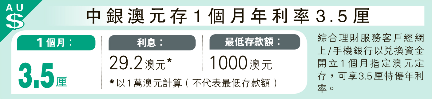 經濟 中銀澳元存1個月年利率3.5厘 發佈於 2 週 前 2025 年 11 月 19 日 By 明報 【明報專訊】綜合理財服務客戶經網上/手機銀行以兌換資金開立1個月指定澳元定存,可享3.5厘特優年利率。 日報新聞-相關報道: 華僑銀行3個月港元定存年息3.2厘 (2025-11-19) 相關文章:華僑銀行3個月港元定存年息3.2厘 (2025-11-19) Up Next 拆息全線向下 分析:投資者借貸需求疲軟 不要錯過 國泰:美撤小額貨免稅累電貿放緩 東南亞需求走強 加班開航線促增長 繼續閱讀 贊助商 猜你喜歡