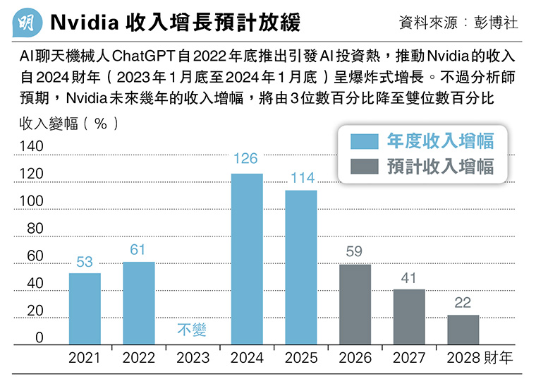 市場近期對AI泡沫的擔憂,已拖累Nvidia股價自4周前觸頂以來,下跌超過12%。彭博社指出,今次下跌反而令Nvidia的估值更具吸引力,其預測市盈率約為29倍,遠低於其10年平均35倍。不過分析師預計,Nvidia未來幾年收入增長將持續放緩(見圖)。