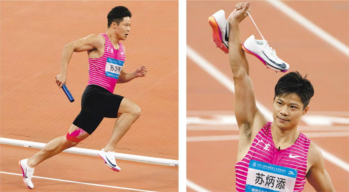 【明報專訊】第15屆全國運動會田徑項目昨於廣東省奧體中心體育場煞科,36歲國家隊短跑名將蘇炳添代表廣東隊在男子4×100米接力決賽以38.71秒得「梗頸四」,在主場的個人田徑選手生涯告別戰與獎牌擦身而過。賽後蘇炳添脫下釘鞋示意「掛靴」,未為失利感遺憾,認為21年田徑運動員生涯已圓滿,未來將續貢獻中國短跑界,期望造就更多人才。