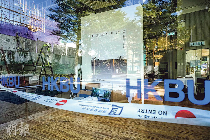 本報記者昨日現場所見,展覽廳門外拉起「不准進入」膠帶,貼有「設施待修,暫停使用」告示,大部分相片已移除。協會成員昨早到展覽廳上層收拾剩餘物資,校方保安一度以「電燈損壞」、「安全問題」為由拒絕他們進入,其後成員入內亦要摸黑收拾。