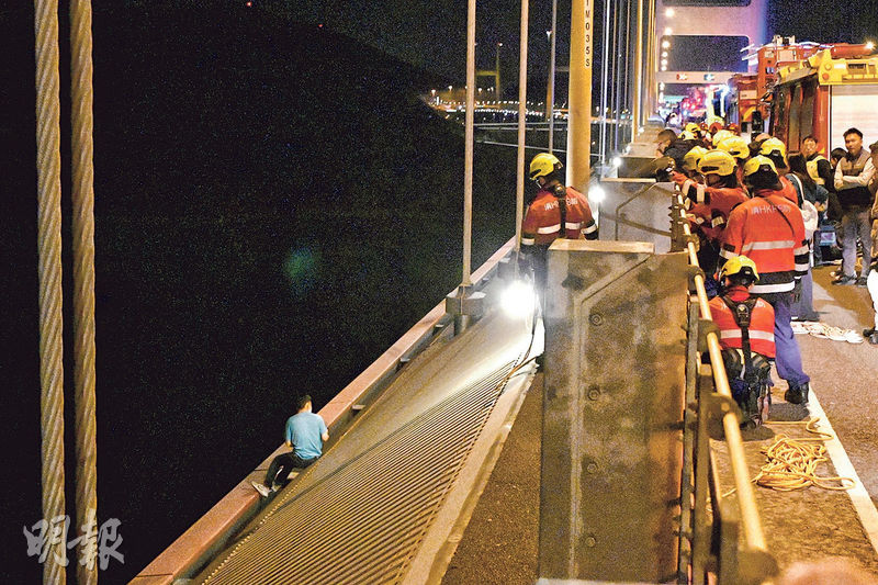 【明報專訊】一名男子前晚乘的士至青馬大橋突要求下車,其後攀過鋼索欄在斜台下危站。警方及消防在橋面與海面戒備,談判專家奉召到場與該男子展開對話,惟約8小時後,男子突一躍而下,失去蹤影,搜救人員至昨深夜仍未有發現。據悉,該男子兒子因病留院,不排除事件涉不開心。