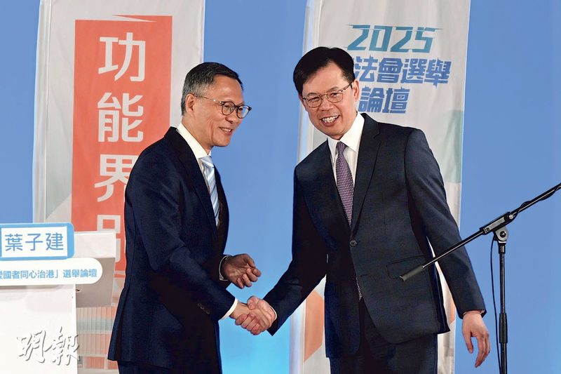【明報專訊】政府同日為立法會工業界(第二)及金融界選舉舉行論壇,兩界別也是由新人挑戰連任者。其中金融界挑戰者葉子建稱,立法會設金融界議席以來,未試過有挑戰者「打敗」現任議員,但相信此局面有一日終會改變,又稱其編號為「T1」、即是1號風球的標誌,若1號風球要變成「破局的大風」,須靠選民支持。爭連任的陳振英說,自己有兩屆議會歷練、熟知業界所需,形容「有經驗是穩健的基礎」,會充當業界溝通橋樑,面對複雜多變的政經形勢,會竭力維護業界經營環境。