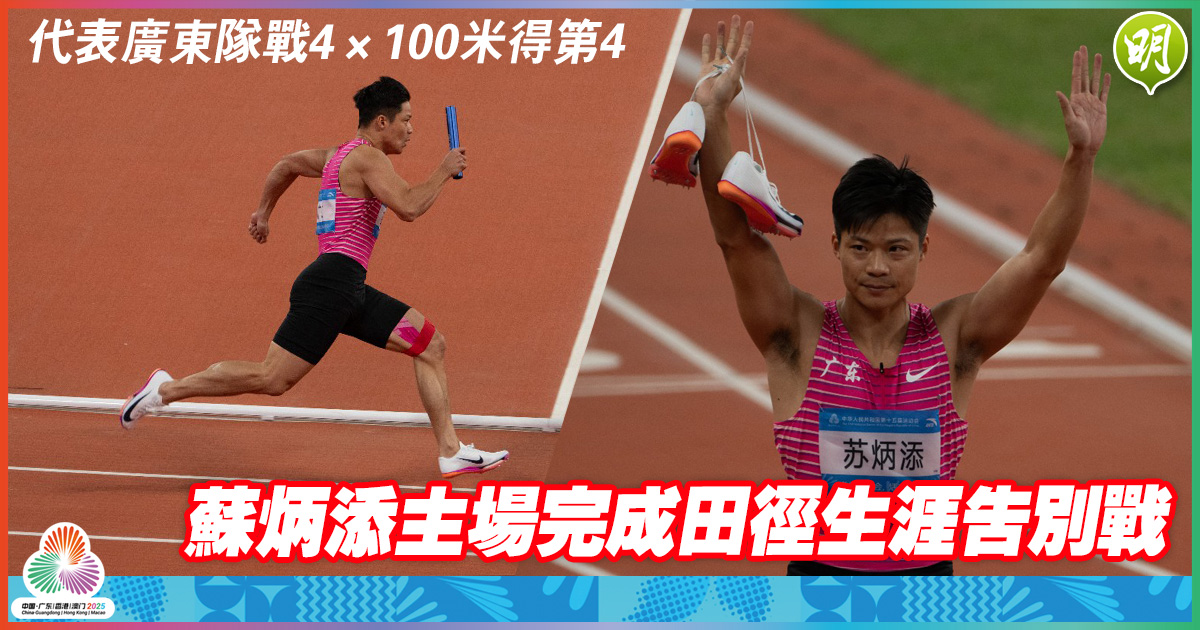 第十五屆粵港澳全國運動會田徑項目今(20日)於廣東省奧體中心體育場煞科,36歲國家隊短跑名將蘇炳添代表廣東隊在男子4×100米接力決賽以38.71秒得「梗頸四」,在主場的個人田徑選手生涯告別戰與獎牌擦身而過。賽後蘇炳添脫下釘鞋示意「掛靴」的他,賽後未為失利感遺憾,「沒必要把輸贏看得那麼重」,認為自己21年田徑運動員生涯已感圓滿,未來將續為中國短跑發展出一分力,期望造就更多人才。