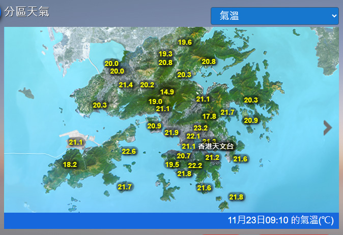 即時熱點 天氣|天文台:今日天晴乾燥 市區最高氣溫料25°C (09:25) 發佈於 1 週 前 2025 年 11 月 23 日 By 明報 天文台早上9時20分錄得氣溫21.3°C,相對濕度62%。本港地區今日(23日)天氣預測:大致天晴。日間乾燥,市區最高氣溫約25°C,新界再高兩三度。吹和緩東北風。 東北季候風正影響華南。本港方面,由於天朗氣清及風勢較弱,晚間輻射冷卻較為明顯,新界部分地區氣溫降至14°C左右。展望本周持續天晴乾燥,日夜溫差頗大。明日(24日)日間溫暖。本周中期早晚清涼。(天文台) 相關文章:天文台天氣天氣速遞編輯推介 Up Next 李小龍誕生85周年展 港鐵香港站中環站看李小龍劇照、電影海報|展覽情報 (15:56) 不要錯過 網傳AI「白金漢宮聖誕市集」片段幾可亂真 遊客親來打卡始知中伏 (18:07) 繼續閱讀 贊助商 猜你喜歡 天氣|天文台:非常乾燥 日間最高22°C (08:47) 天氣|天文台:非常乾燥最高23°C 明早市區降至約15°C (08:24) 天氣|天文台:周四天晴非常乾燥 市區最低17°C (21:11) 天氣|天文台:本港今早較昨日低兩至三度 日間非常乾燥 (08:23) 天氣|天文台:周三天晴非常乾燥 早上清涼市區最低17°C (20:58) 天氣|天文台:最高25°C 本周持續天晴乾燥 (08:20)