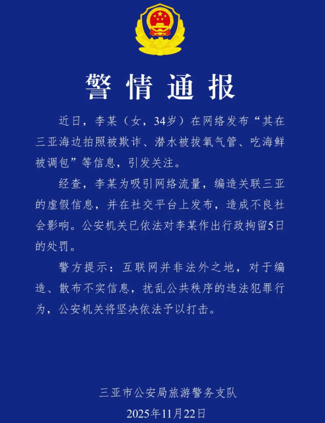 即時兩岸 女子網上發布假信息「三亞潛水被拔氧氣管」 遭行政拘留5日 (15:56) 發佈於 1 週 前 2025 年 11 月 23 日 By 明報 海南省三亞市公安局旅遊警務支隊發布警情通報稱,34歲李姓女子在網絡發布「其在三亞海邊拍照被欺詐、潛水被拔氧氣管、吃海鮮被掉包」等信息,引發關注。經查,李為吸引網絡流量,編造關聯三亞的虛假信息,並在社交平台上發布,造成不良社會影響。公安機關已依法對李作出行政拘留5日的處罰。 警方提示,互聯網並非法外之地,對於編造、散布不實信息,擾亂公共秩序的違法犯罪行為,公安機關將堅決依法予以打擊。(「三亞警方」微信公眾號) 相關文章:發布虛假信息編輯推介 Up Next 四川省原副省長、公安廳原廳長葉寒冰遭「雙開」 (16:45) 不要錯過 台軍高雄展示裝備 AAV7兩棲突擊車吸引打卡 (23:56) 繼續閱讀 贊助商 猜你喜歡