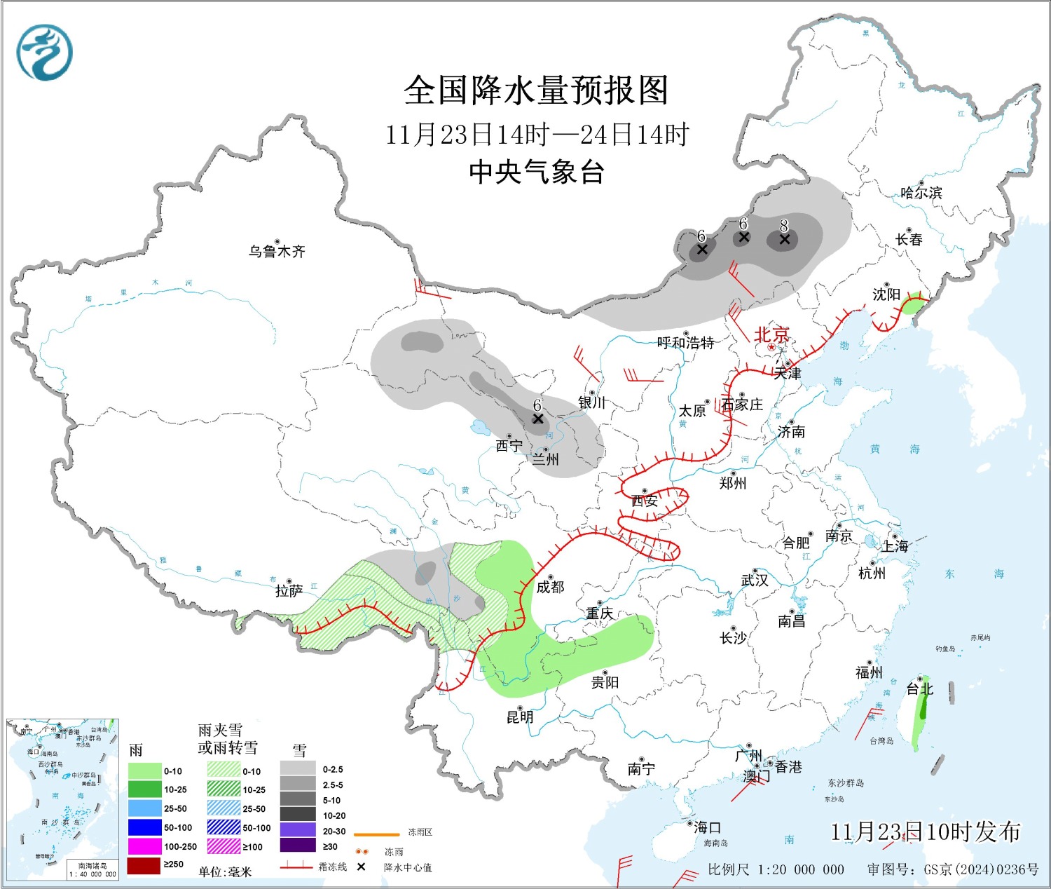 內地將接連受到3股冷空氣影響。一股冷空氣今明(23日至24日)兩日將由西向東影響全國,北方部分地區降溫幅度可達10℃以上。甘肅、青海北部、內蒙古及東北等地將降雪。