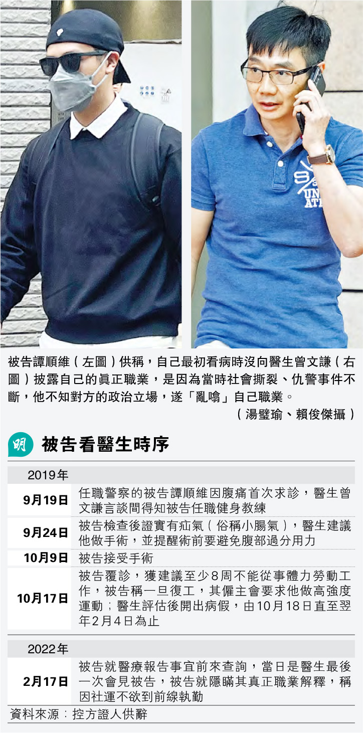 被告稱,曾文謙看診期間稱「你都幾大隻㗎喎,你做咩職業㗎?」他感害怕,「冇諗過睇醫生要講職業」,加上不知對方政治取向,遂「亂噏」自己為健身教練。10月手術完成後,被告仍感腹痛,遂於17日覆診時提出希望獲發更多病假,最終於翌年2月初復工。2022年他接受特警訓練,2月就此會見曾文謙查詢醫療報告事宜,並披露自己的真正職業。