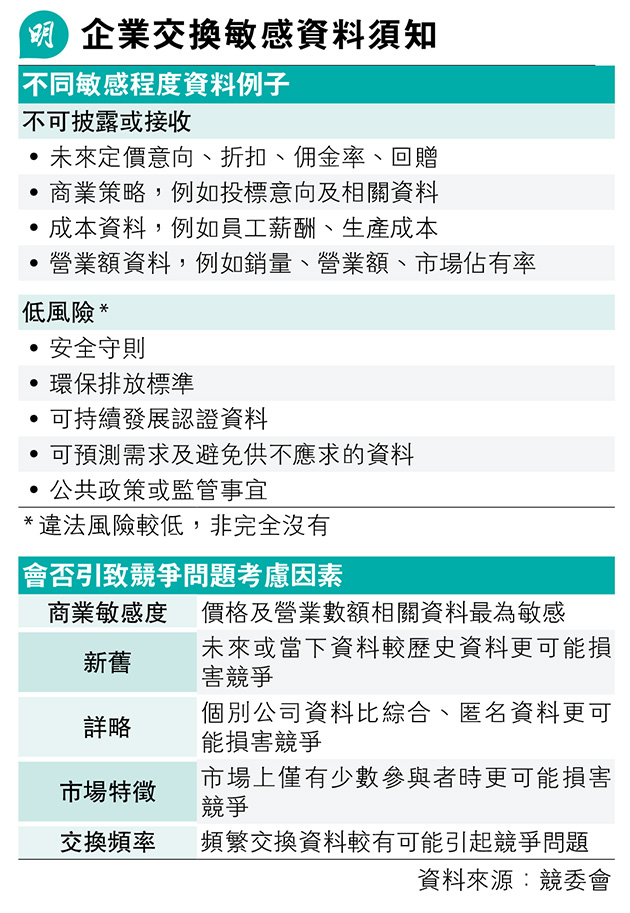 同行交換敏感資料或違競爭例 涵價格成本商業策略 競委會籲識別違法風險