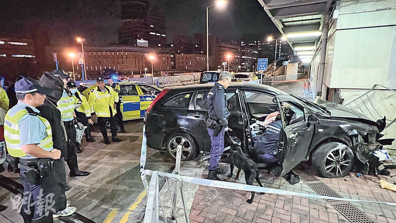 私家車其後在柯士甸道高速駛上暢運道天橋往紅磡站,於左轉安運道時失控,掃毁約5米欄杆,再剷上行人路,撼向車站外牆,警員隨即將男司機制服拘捕,事件中無人受傷。
