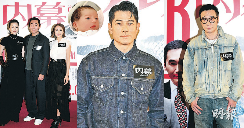 郭富城、吳鎮宇、方中信、姜大衛、湯怡、陳國邦、老闆楊受成、導演麥兆輝和監製田啟文等昨晚出席《內幕》首映禮。郭富城10月生日登「六」,加上三女出世、拉頭馬,三喜臨門,吳鎮宇也為他鼓掌:「夫妻生活美滿,四年抱三。」郭富城感恩事業、家庭兩得意,又喜迎新戲上映,「《內幕》上畫是第四喜,希望電影得到觀眾支持,票房好好,希望有第五喜」。
