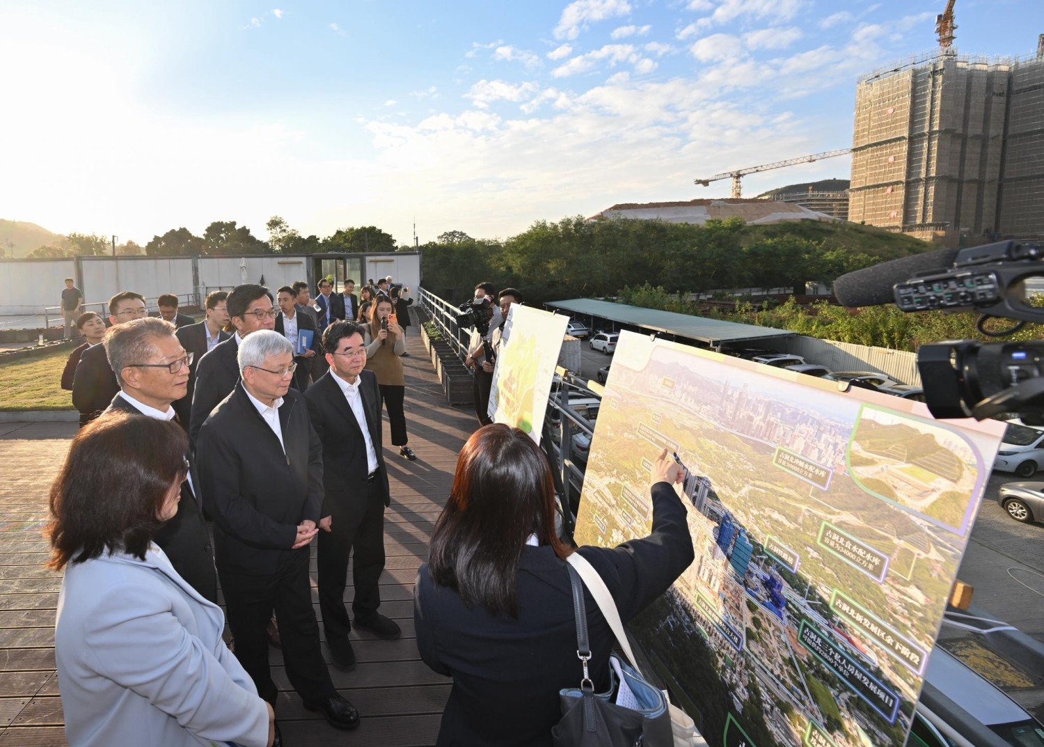 兩位中央宣講團成員在陳茂波、財政司副司長黃偉綸、發展局長甯漢豪及創新科技及工業局長孫東等人陪同下,先到訪古洞北新發展區,了解新發展區及北都的規劃及建設情况,包括到訪地盤辦公樓。