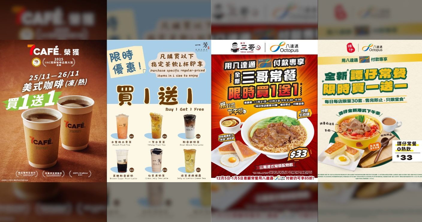 買一送一優惠:7-Eleven咖啡、一芳台式飲品、譚仔及譚仔三哥下午茶餐|著數情報 (17:36)