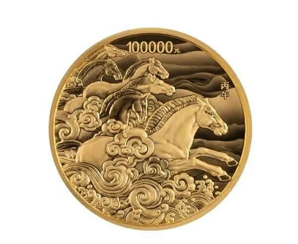 該套貴金屬紀念幣正面圖案均為中華人民共和國國徽,襯以中國傳統吉祥紋飾,並刊國名、年號。背面圖案則各有不同,10公斤圓形金質紀念幣背面圖案為群馬奔騰造型,襯以祥雲、山、水紋組合設計;1公斤梅花形金質紀念幣背面圖案為奔馬造型;500克圓形金質紀念幣背面圖案為裝飾馬頭造型;150克圓形金質紀念幣背面圖案為母子馬造型。(央視新聞)