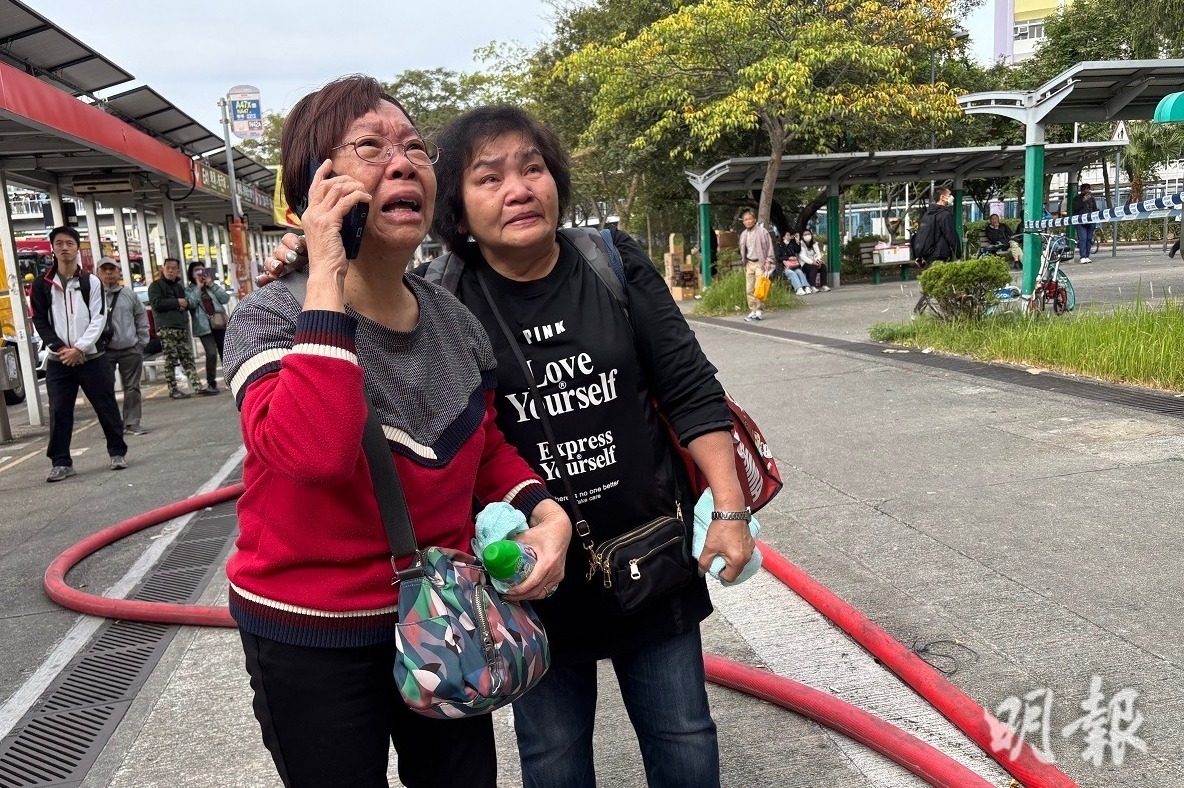 大埔宏福苑五級火火場附近有大批居民守候,凝望火場,有家住宏仁閣30樓的女住戶今早(27日)10時在外圍看到家住的大廈仍有單位在焚燒,一度激動嚎哭。亦有宏昌閣居民苦候失蹤家人消息,稱昨晚起與太太失聯,盼望可盡快尋回,「生又好死又好,救佢出嚟先,唔想留佢喺個度」。
