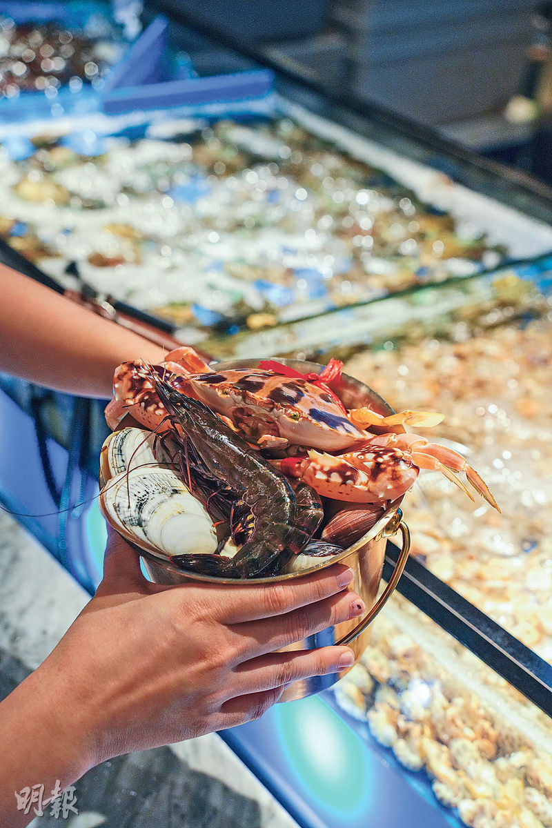 餐廳室內空間以海洋為設計主題,以沉浸式投影和環迴聲效系統打造海洋氛圍用餐區,大家可以一邊吃火鍋,一邊看身旁「鯨魚」暢泳,為用餐體驗加分。活海鮮區長達8米,水缸內有10多款海鮮,一眼也未能盡覽。餐廳職員指,即撈海鮮種類因應當日魚獲而定。記者採訪當日,有藍蟹、三點蟹、花蟹、鮑魚、九節蝦、大頭蝦、刀貝、沙白、翡翠螺等,鮮活生猛。每枱有1個不鏽鋼小水桶,客人先揀海鮮,裝滿一桶後可交由專人清洗處理,稍候片刻再憑號碼領回,服務員更會貼心將蟹剖半方便食用。記者試吃,海鮮新鮮乾淨,貝類也不見有沙,肥美鮮甜。