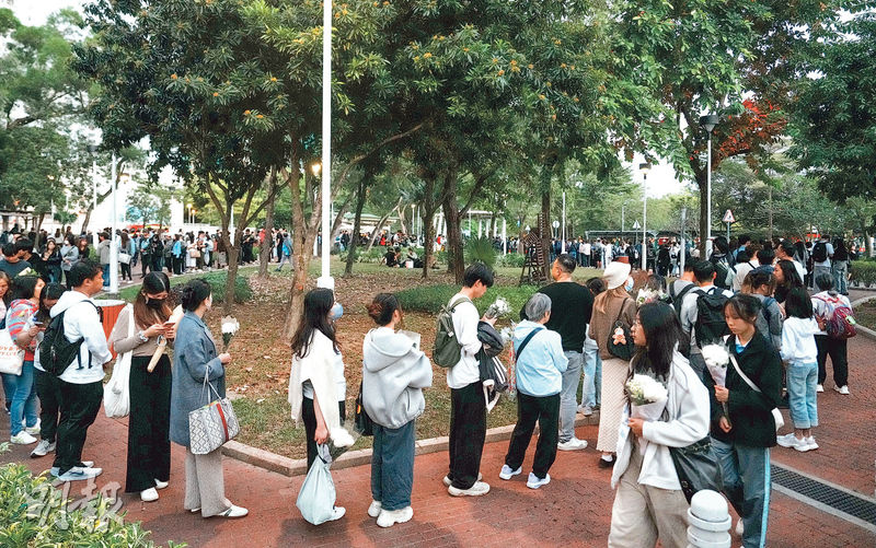 【明報專訊】這場五級火摧毀近2000個家園,香港人人心情沉重,各有方式悼念,以表心意。昨午起陸續有市民到宏福苑前的廣福休憩處獻花、寫心意卡,為死者默哀;大埔富亨邨百佳超級市場外則設心意牆,給市民寫上祝福。傍晚五六時所見,排隊獻花至少數百人,現場有市民派發黑絲帶,人龍綿延數百米,當中除了大埔居民,亦有港島及九龍居民。有人「一睇(新聞)就眼淚流,個心好沉重」,有人期望政府加強監管及安置居民。
