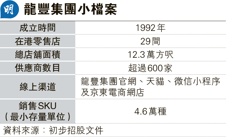 現時龍豐平均單店供應6500個SKU(最小存貨單位),整體銷售超過4.6萬個SKU。銷售商品涵蓋11個大類,包括中成藥、西藥、保健品、護膚品、化妝品、香水、個人護理、生活雜品、母嬰護理、食品及寵物用品;同時建立逾40個自家品牌。平均店舖面積超過4250方呎,位於旺角家樂坊的旗艦店以總樓面面積計算,為2024年香港最大藥妝零售店,樓面約1.75萬方呎。文件顯示,是次上市集資所得,擬用於擴大、加強及優化實體及線上銷售網路,預期至2029年3月底止年度在港開設最多11間新零售店,並用於品牌管理及市場推廣、擴充及升級日、韓的現有海外採購分支辦事處等,亦會將集資所得用於資訊系統升級、償還貸款及一般營運資金。