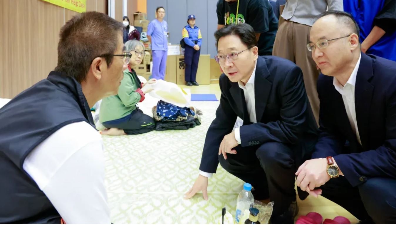 港澳辦副主任農融與中聯辦主任周霽到訪大埔東昌街社區會堂、東昌街體育館臨時庇護中心和大埔船灣臨時安置點,向受災者轉達國家主席習近平及中央政府的慰問。