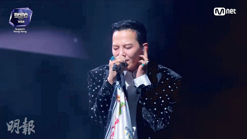 【明報專訊】闊別7年再臨香港的韓國音樂頒獎禮《2025 MAMA Awards》(簡稱MAMA),上月28及29日一連兩晚假香港啟德體育園主場館舉行。前晚第2場,男團BigBang隊長G-Dragon(GD)壓軸登場,一口氣演唱三首歌曲《Drama》、《Heartbreaker》及《無題》,掀起全晚高潮。然而他唱《無題》期間,大會音響疑似出現問題,現場只聽到背景音樂,GD的歌聲卻異常微弱,他多次把耳機摘下再戴,還一度露出不悅神情。GD其後在MAMA官方社交媒體Instagram(Ig)他的演出片段帖文,留下一個「倒讚」表情符號,以示不滿音響效果。GD當晚獲周潤發頒發年度藝人大獎,有網民拍得GD扶着發哥落台,兩人更一路牽着手返回後台,其間二人一直交談,絕無隔閡。