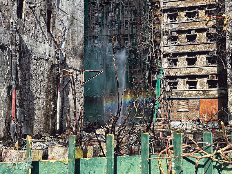 【明報專訊】37歲消防員何偉豪上周三(11月26日)在大火發生當天進入火場救援時不幸殉職。警方昨午安排何的家屬及其同袍在災場外圍露天拜祭,家屬與數十名同袍將白花捧在胸前,再逐一上前輕輕放在宏昌閣對出草叢旁,其間不少人獻花後忍不住啜泣。同一時間,消防昨繼續在宏昌閣對出空地灑水,該處是何偉豪最後被發現的地方,儀式期間空地上方一度出現一抹從水花折射的彩虹。
