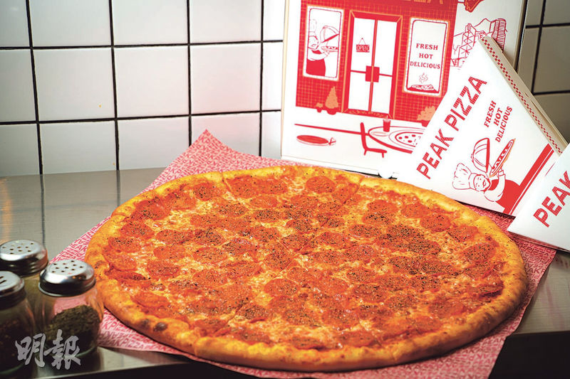 【明報專訊】位於山頂的Peak Pizza最近在中環核心地段開設分店,走的是效率至上路線。甫踏入店內,空氣中瀰漫鹹香的烘烤香氣,眼前數個巨大20吋薄餅在玻璃櫃排開,店員熟練地取出客人選好的三角切片薄餅,放入烤爐中迅速翻熱,再放在紙盤上遞出,猶如紐約街頭薄餅店那種快捷而忙碌的場景。