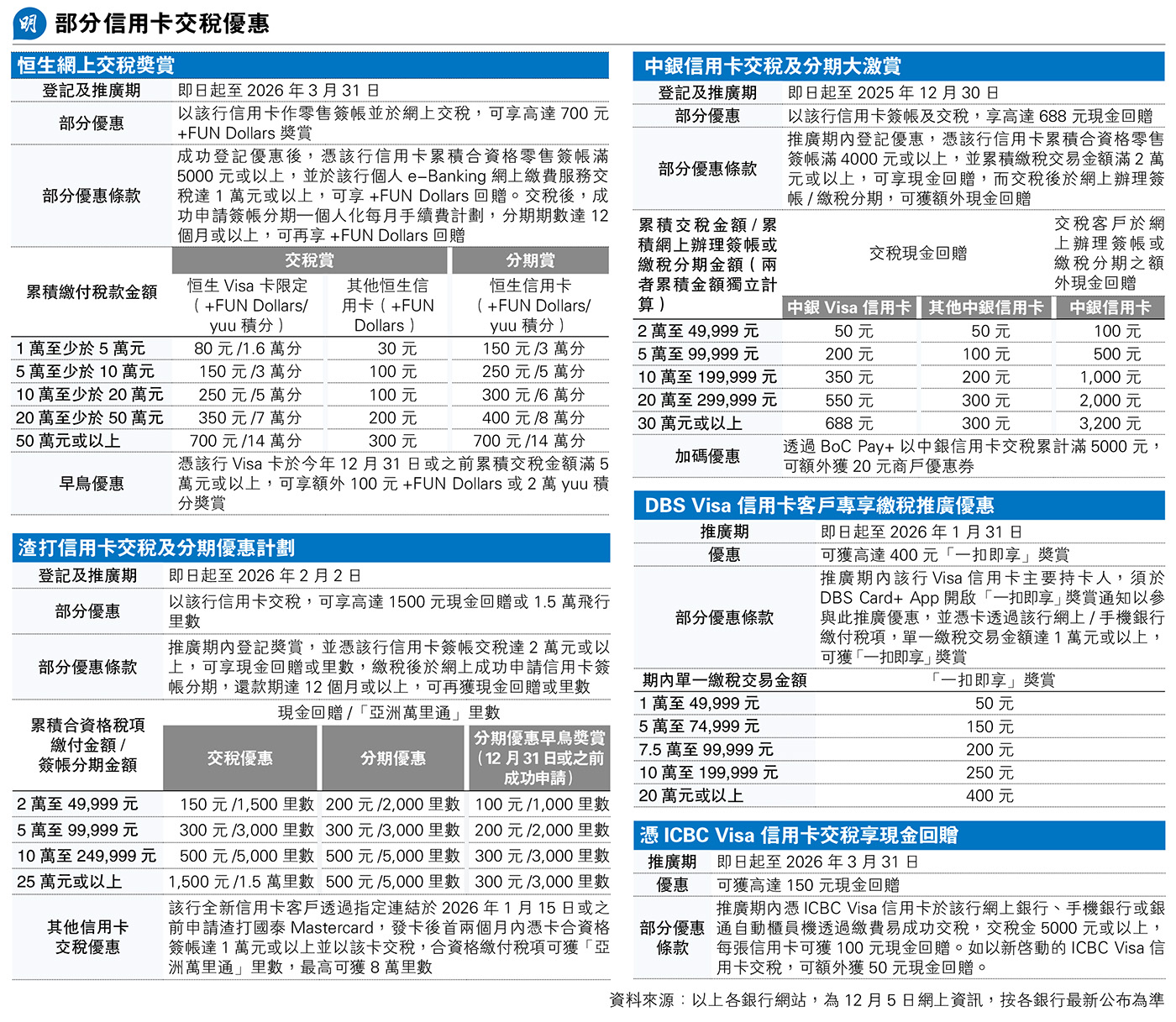 【明報專訊】隨着納稅人陸續收到稅單,近月各銀行相繼推出稅貸應市。對於無借貸需要的納稅人,不妨留意部分銀行推出的信用卡交稅優惠,個別銀行優惠的現金回贈可逾千元,惟要留意獲取相關優惠條款。目前以信用卡交稅一般不會獲得信用卡積分,最近部分銀行有就信用卡交稅推出現金回贈或飛行里數獎賞,但要留意要獲取相關優惠,除需事前登記優惠,以及繳稅金額需達指定門檻外,或需同時累積零售簽帳滿指定金額。此外,部分信用卡交稅優惠更有附設信用卡分期優惠,以提供額外現金回贈或獎賞,但需留意大部分信用卡分期優惠所提供的並非免息分期。