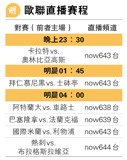 同日其餘賽事,上輪首吞敗績後暫居季席的德甲班霸拜仁慕尼黑將迎戰排第8位的葡超球隊士砵亭,英超勁旅車路士則作客賽前同得10分的意甲球隊阿特蘭大。至於僅排第18位的西甲榜首之師巴塞隆拿將在主場面對德甲的法蘭克福,力爭各項賽事四連勝。