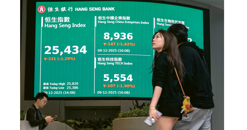 【明報專訊】儘管市場幾乎肯定聯邦儲備局於12月將一如預期,會減息25點子(100點子等於1厘),惟投資者更關注會後議息聲明和記者會對未來息率政策走向或有放鷹信號,拖累亞太區股市普遍出現下跌。再加上中央政治局會議,市場解讀中央未有太積極迫切推出刺激政策,拖累港股繼周一跌319點後,昨日最多跌378點,收市時跌幅仍達331點,全日收報25,434點,恒指連跌兩日累挫650點。而昨日成交額達2102.36億元,單日增加40.06億元。