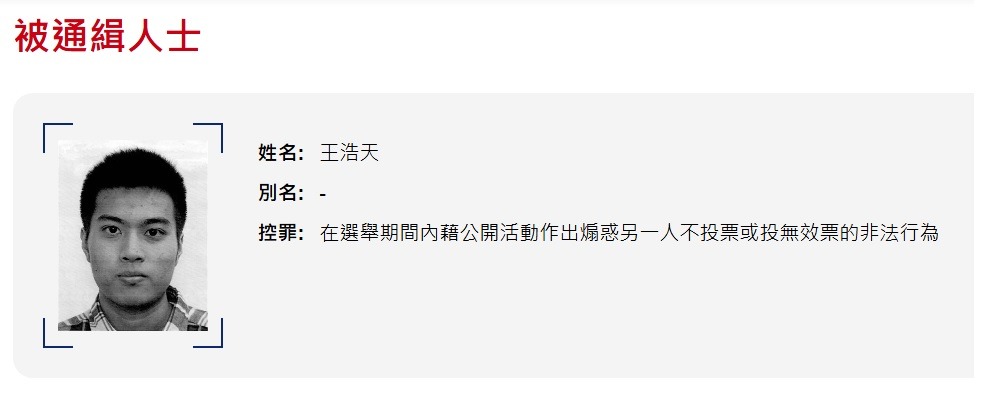 即時港聞 立法會選舉|廉署通緝一名24歲男子 涉嫌於社交平台留言煽惑他人不投票 (16:33) 發佈於 4 週 前 2025 年 12 月 7 日 By 明報 立法會選舉今(7日)舉行。廉政公署表示,今日獲裁判官簽發手令通緝一名24歲男子王浩天,他涉嫌在昨日(6日)於社交平台留言公開煽惑他人不投票,企圖破壞選舉,觸犯《選舉(舞弊及非法行為)條例》(《選舉條例》)第27A條。 廉署就本屆立法會選舉先後拘捕共11人,包括於今日拘捕4人,涉嫌干犯《選舉條例》第27A條,當中3人已被落案起訴。廉署重申,在選舉期間內公開煽惑他人不投票或投無效票,會觸犯《選舉條例》第27A條。 相關文章:包括於今日拘捕4人廉政公署立法會選舉編輯推介 Up Next 立法會選舉|唐英年籲團結一致投票 長實李澤鉅「祝願選舉成功」 (16:10) 不要錯過 立法會選舉|新界西南選區5女將競逐議席 有候選人告急 (18:21) 繼續閱讀 贊助商 猜你喜歡 廉署拘21人揭觀塘區兩屋苑大維修涉貪 指有黑社會背景人士背後操縱 藉貪污手段收集授權票 (12:39) 曾國衞:對立法會選舉整體成效感滿意 仍在分類無效票現不作評論 (15:27) 立法會選舉︱無效票數達回歸後新高 曾國衞:難就原因下定論 (16:53) 【Emily】民思:星10年前已部署 港AI落後6年 3方面尤明顯 倡設AI Verify統一監管 工程師認偷李慧琼選舉宣傳海報 稱不想每天看到 判罰1000元 (18:13) 立會候任議員料新年首兩天宣誓