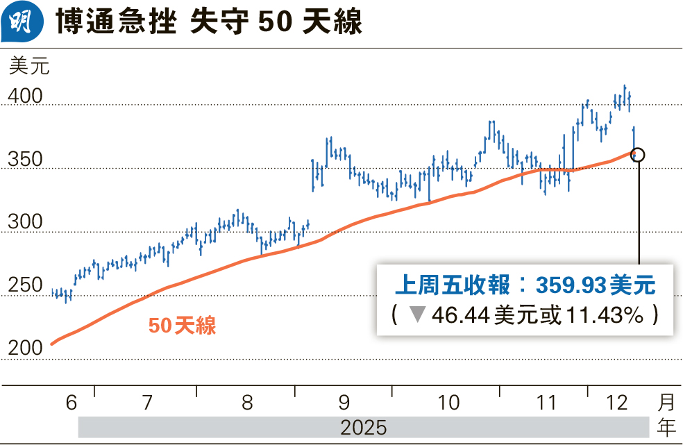 博通上周五股價跌穿50天線(見圖),市值單日蒸發約2192億美元,甲骨文(美:ORCL)受市場關注債務而跌4.47%,而費城半導體指數跌5.1%。消息拖累其他相關股份,ASML(美:ASML)跌3.74%,Nvidia(英偉達)(美:NVDA) 跌3.27%,續收低於50天線水平。其他重磅科技股方面,Alphabet(美:GOOGL)跌1%,微軟(美:MSFT)跌1.02%。但蘋果(美:AAPL)逆市升0.09%。