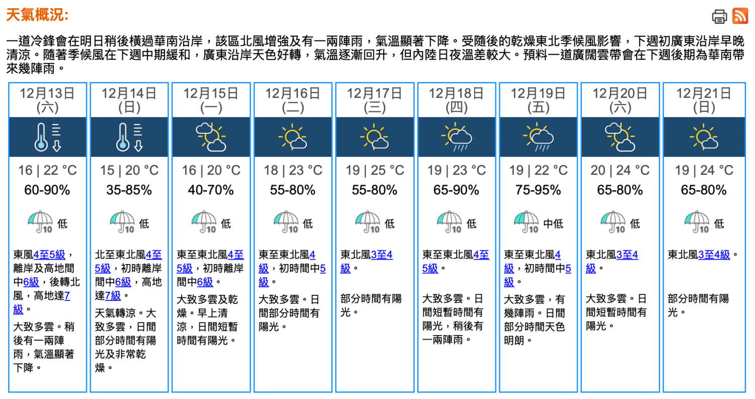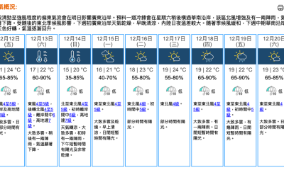 即時熱點 天氣|天文台:周六多雲有雨 日間最高22℃ 午夜跌至16℃ (21:48) 發佈於 4 天 前 2025 年 12 月 12 日 By 明報 天文台預測,本港明日(13日)漸轉多雲。明早氣溫約20℃,日間最高氣溫約22℃。吹和緩至清勁偏東風,離岸及高地間中吹強風。明日稍後轉吹偏北風,有一兩陣雨,氣溫顯著下降至午夜約16℃。展望下周日(14日)及周一(15日)市區最低氣溫在15、16℃左右,新界再低兩三度。下周中期部分時間有陽光,氣溫逐漸回升。(天文台) 相關文章:天文台天氣天氣速遞編輯推介 Up Next 聖誕節.短片|47米高光影聖誕樹灣仔海濱亮燈 Festilumi沉浸式光影樂園登場 (20:43) 不要錯過 天氣|天文台:周五多雲部分時間有陽光 氣溫21至24℃ (21:31) 繼續閱讀 贊助商 猜你喜歡 天氣|天文台:周一市區16°C-20°C 多雲乾燥 相對濕度料低至45% (19:08) 天氣|天文台:今日大致多雲非常乾燥 市區氣溫料16°C-20°C (09:40) 天文台:冷鋒稍後橫過廣東沿岸 周日早上市區最低14°C (12:22) 天氣|天文台:多雲有陣雨 午夜氣溫低至16°C (10:07) 天氣|天文台:天晴乾燥最高24°C 明日氣溫顯著下降 (08:43) 天氣|天文台:周五多雲部分時間有陽光 氣溫21至24℃ (21:31)
