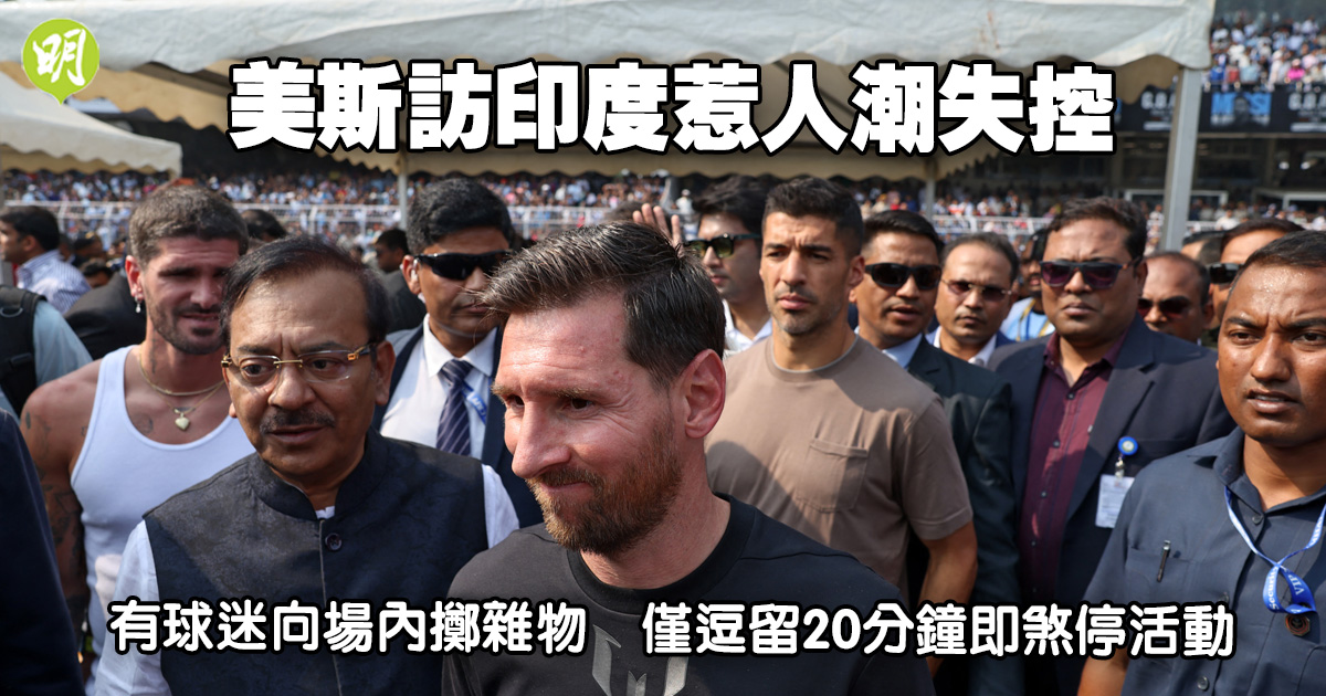 38歲阿根廷球王美斯今日(13日)到訪印度為個人銅像揭幕,並原定參加一場名為「GOAT印度巡迴2025」的活動,在加爾各答的鹽湖體育場繞場並與當地球迷互動,惟活動開始不久即出現人潮失控,最終引起球迷騷動,場面混亂下令美斯僅逗留20分鐘便離開。
