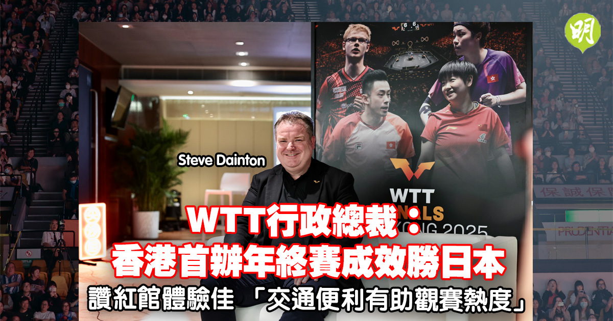 世界乒乓球職業大聯盟(WTT)年終總決賽今年起連續三年登陸香港,這項頂級乒乓賽事開賽即穫眾多好評,WTT行政總裁(CEO)Steve Dainton今(12日)受訪時大讚辦賽成效,坦言比上屆日本福岡站更勝一籌,「香港站無疑把標準提升到了新的高度」。